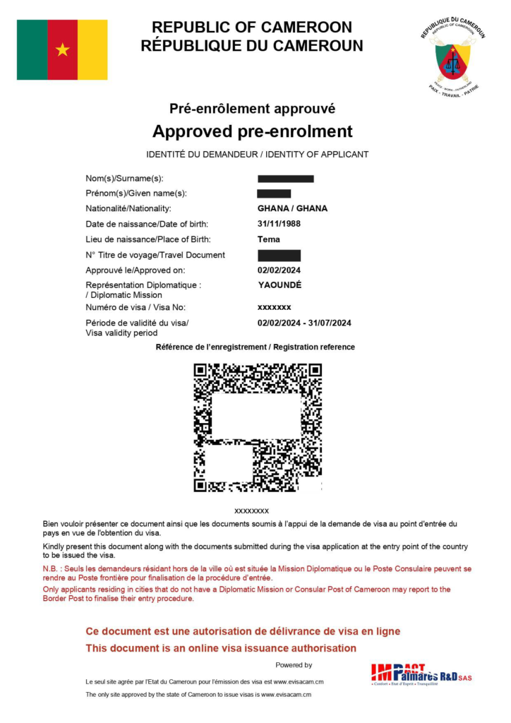Upon approval of your eVisa, you will get the eVisa via email. Print a copy and download it because you would be required to present it to the immigration officials in Cameroon. You can also have the online copy in your phone in case of a backup.