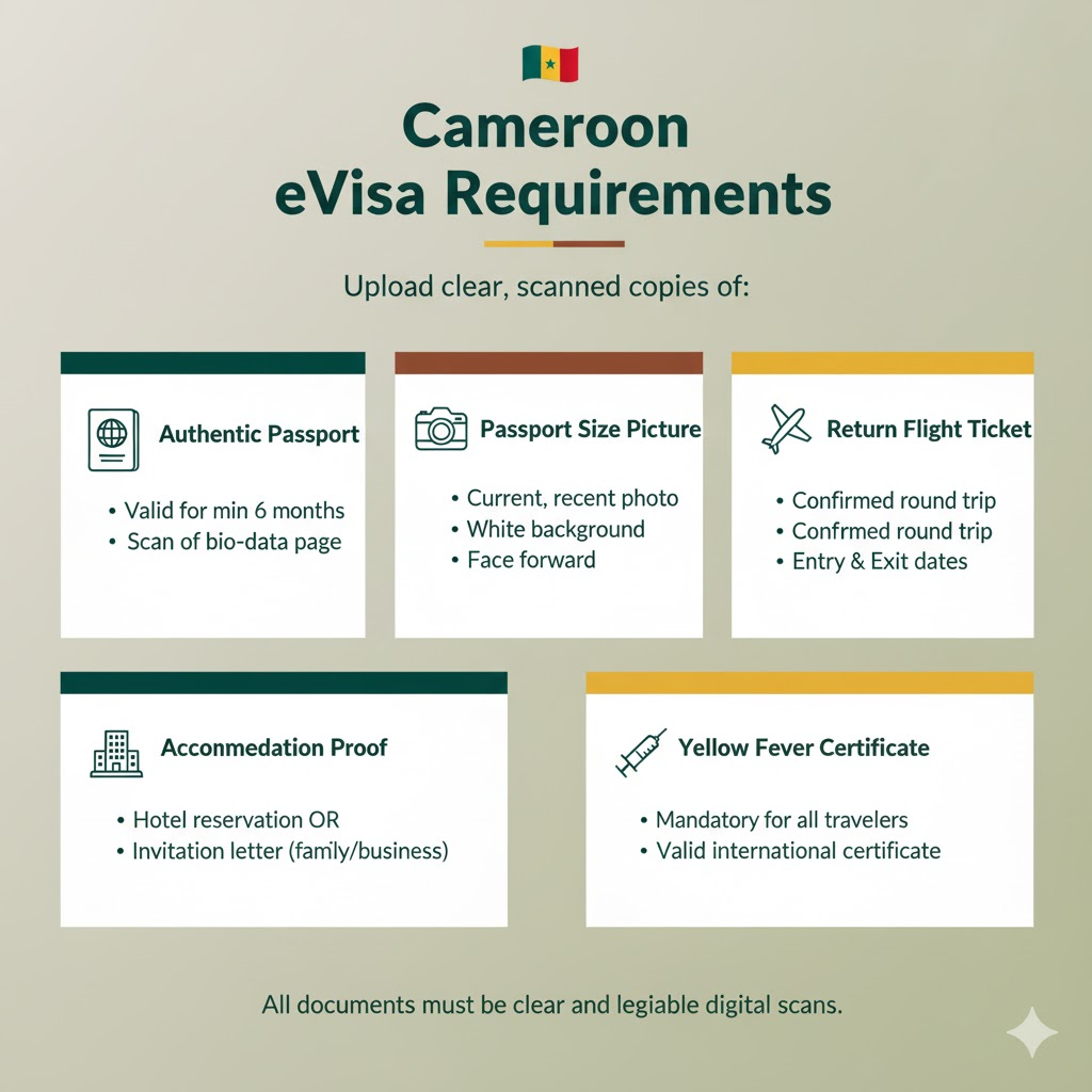 Some of the documents will have to be uploaded in clear and scanned copies. These usually include Cameroon Visa Requirements: