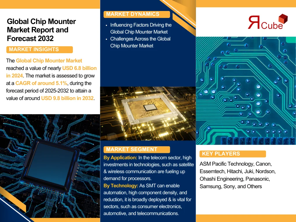 The Report Cube which is one of the leading market research company in UAE expects the Chip Mounter Market to grow at a CAGR of around 5.1% through 2032, as highlighted in their latest research report. The study provides an in-depth analysis of the emerging trends shaping the Chip Mounter Market and offers detailed forecasts for its potential growth during 2025–2032. The report also presents a comprehensive assessment of the competitive landscape, including profiles of leading players, their performance metrics, and recent strategic developments. Additionally, it explores the key market drivers, challenges, opportunities, and provides insights into historical and future revenue trends at the global, regional, and country levels.