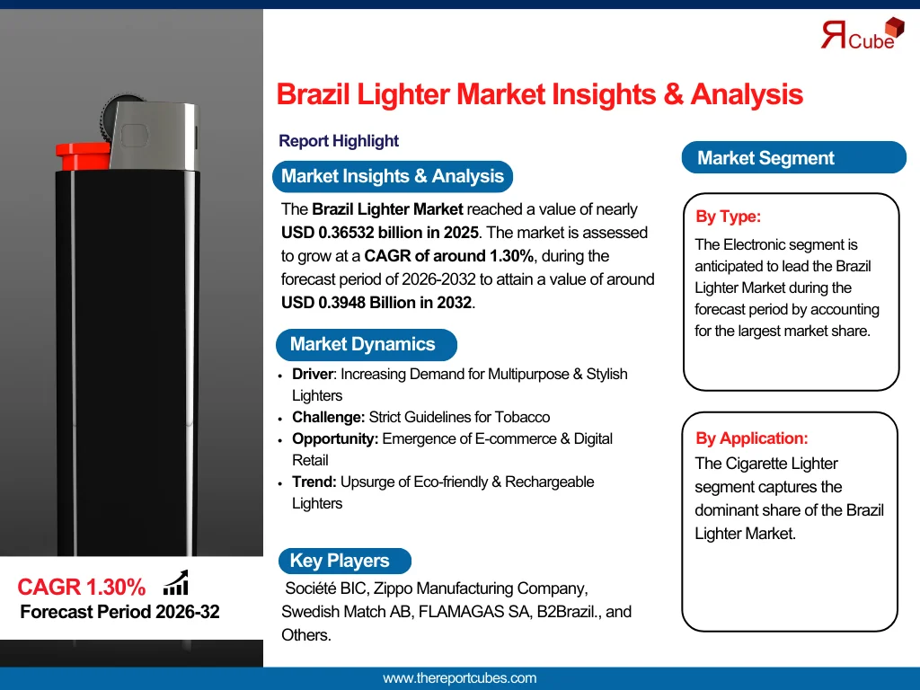 The Report Cube which is one of the leading market research company in UAE expects the Brazil Lighter Market to grow at a CAGR of around 1.30% through 2032, as highlighted in their latest research report. The study provides an in-depth analysis of the emerging trends shaping the Brazil Lighter Market and offers detailed forecasts for its potential growth during 2026–2032. The report also presents a comprehensive assessment of the competitive landscape, including profiles of leading players, their performance metrics, and recent strategic developments. Additionally, it explores the key market drivers, challenges, opportunities, and provides insights into historical and future revenue trends at the global, regional, and country levels.
