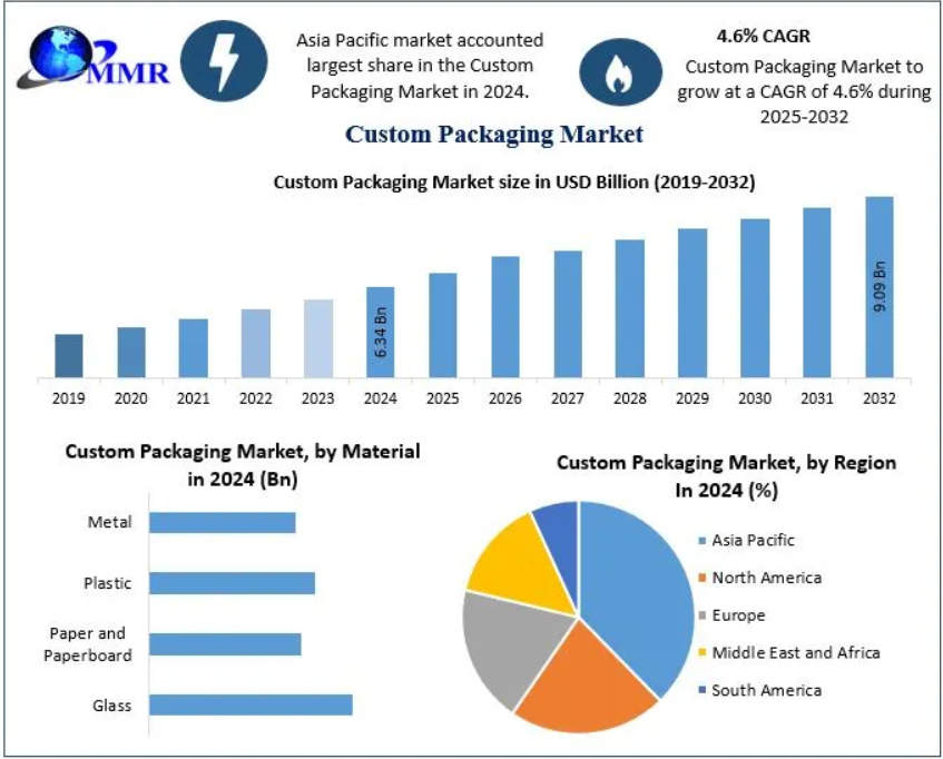 The Global Custom Packaging Market was valued at USD 6.34 billion in 2024 and is projected to reach USD 9.09 billion by 2032, growing at a CAGR of 4.6% during the forecast period (2025–2032). Rising demand for personalized, sustainable, and brand-focused packaging solutions across industries such as food & beverage, cosmetics, and healthcare is driving the market’s rapid evolution. Custom packaging enables brands to enhance consumer engagement, improve product protection, and differentiate themselves in an increasingly competitive retail landscape.