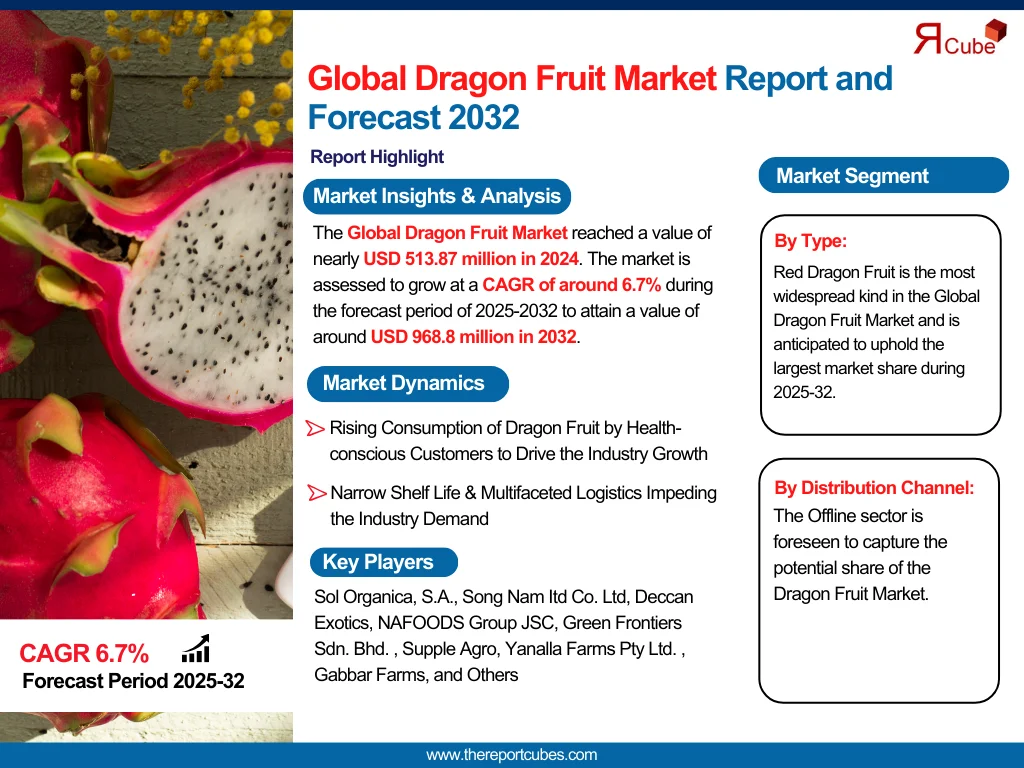 The Report Cube which is one of the leading market research company in UAE expects the Dragon Fruit Market to grow at a CAGR of around 6.7% through 2032, as highlighted in their latest research report. The study provides an in-depth analysis of the emerging trends shaping the Dragon Fruit Market and offers detailed forecasts for its potential growth during 2025–2032. The report also presents a comprehensive assessment of the competitive landscape, including profiles of leading players, their performance metrics, and recent strategic developments. Additionally, it explores the key market drivers, challenges, opportunities, and provides insights into historical and future revenue trends at the global, regional, and country levels.
