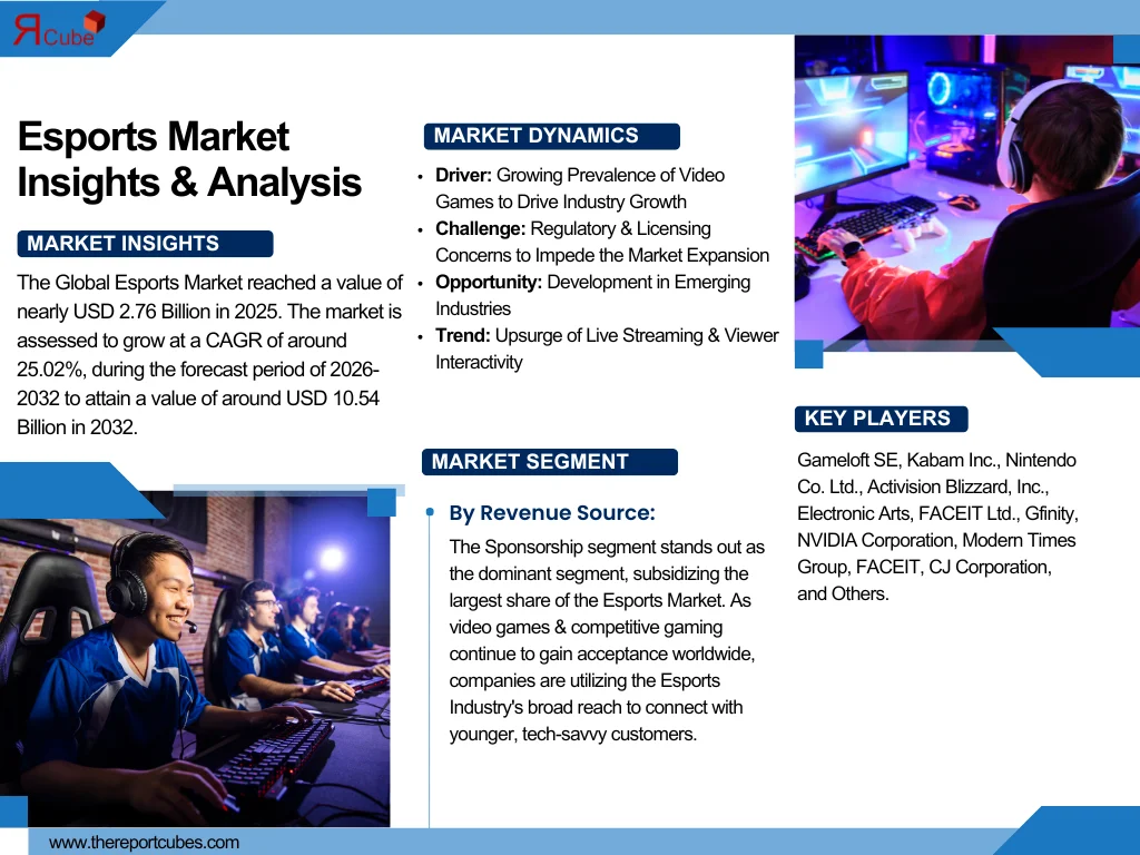 According to recent study by The Report Cube the Esports Market reached a value of nearly USD 2.76 Billion in 2025. The market is assessed to grow at a CAGR of around 25.02%, during the forecast period of 2026-2032 to attain a value of around USD 10.54 Billion in 2032.