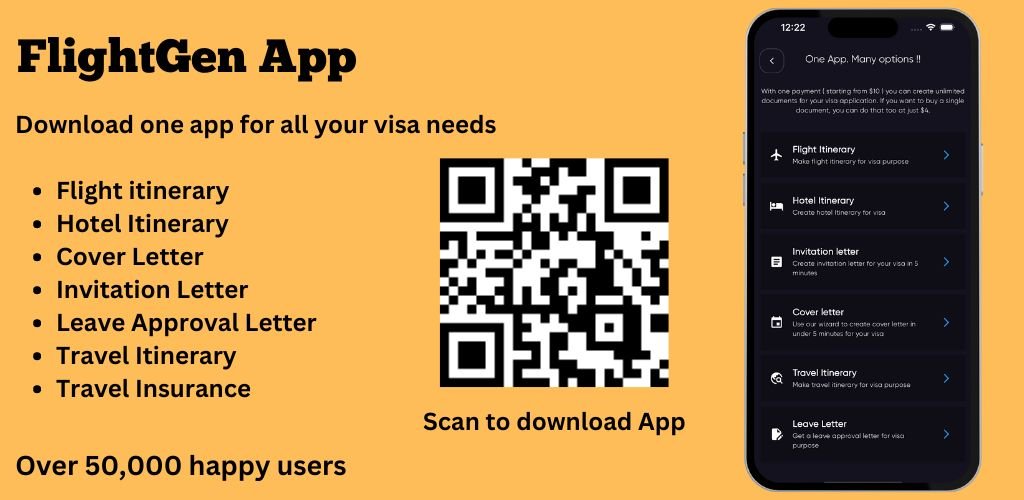 - Visa documents – Get your essential visa documents in one FlightGen app like Cover letter for visa, Travel Itinerary, Noc for visa, Dummy flight ticket for visa, Dummy flight Itinerary for visa, Invitation letter for visa , Flight Itinerary for visa and Leave letter for visa.