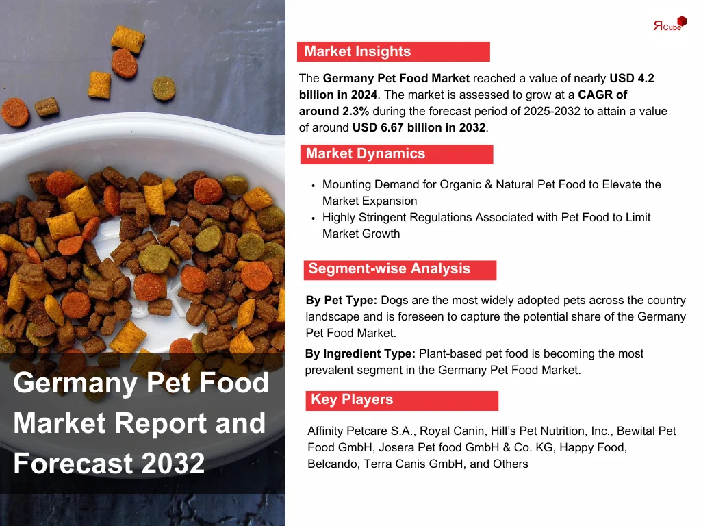 The Report Cube which is one of the leading market research company in UAE expects the Germany Pet Food Market to grow at a CAGR of around 2.3% through 2032, as highlighted in their latest research report. The study provides an in-depth analysis of the emerging trends shaping the Germany Pet Food Market and offers detailed forecasts for its potential growth during 2025–2032. The report also presents a comprehensive assessment of the competitive landscape, including profiles of leading players, their performance metrics, and recent strategic developments. Additionally, it explores the key market drivers, challenges, opportunities, and provides insights into historical and future revenue trends at the global, regional, and country levels.