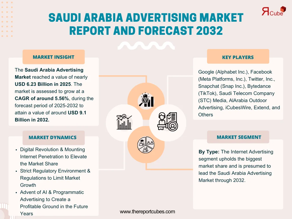 The Report Cube which is one of the leading market research company in UAE expects the Saudi Arabia Advertising Market to grow at a CAGR of around 5.56% through 2032, as highlighted in their latest research report. The study provides an in-depth analysis of the emerging trends shaping the Saudi Arabia Advertising Market and offers detailed forecasts for its potential growth during 2025–2032. The report also presents a comprehensive assessment of the competitive landscape, including profiles of leading players, their performance metrics, and recent strategic developments. Additionally, it explores the key market drivers, challenges, opportunities, and provides insights into historical and future revenue trends at the global, regional, and country levels.