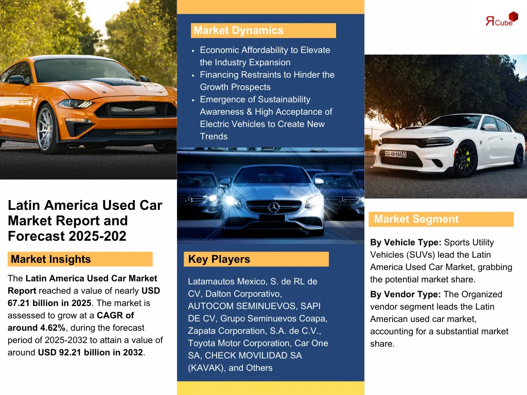 The Report Cube which is one of the leading market research company in UAE expects the Latin America Used Car Market to grow at a CAGR of around 4.62% through 2032, as highlighted in their latest research report. The study provides an in-depth analysis of the emerging trends shaping the Latin America Used Car Market and offers detailed forecasts for its potential growth during 2025–2032. The report also presents a comprehensive assessment of the competitive landscape, including profiles of leading players, their performance metrics, and recent strategic developments. Additionally, it explores the key market drivers, challenges, opportunities, and provides insights into historical and future revenue trends at the global, regional, and country levels.