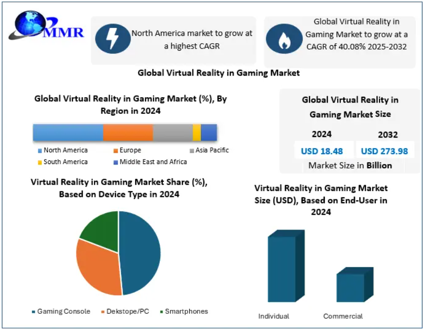 The Global Virtual Reality (VR) in Gaming Market was valued at USD 18.48 billion in 2024 and is projected to grow at an astonishing CAGR of 40.08% from 2025 to 2032, reaching nearly USD 273.98 billion. The rapid adoption of digital technologies, immersive gaming experiences, and innovative VR devices are driving this exponential growth.